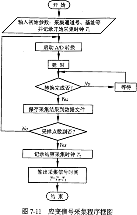 對應(yīng)于所選用的A/D轉(zhuǎn)換板,編制的應(yīng)變信號采集程序框圖如圖7-11所示。