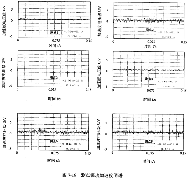 圖7-19所示是一組輸出轉(zhuǎn)矩為875N.m,轉(zhuǎn)速為1080r/min工況時的實測振動加速度結(jié)果,加速度最大值及對應(yīng)的時間標(biāo)記在圖上。(1×e-1v代表1m/s2)