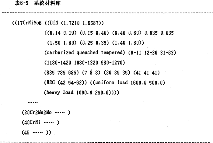 軸、箱體以及對大型組裝具輪采用的支撐部分的材料的選擇方法類同于齒輪材料,在此不詳細討論。若當前材料數(shù)據(jù)庫無可供選擇的材料時,系統(tǒng)便要求用戶輸入指定的材料特性,并按相應的格式加入到材料數(shù)據(jù)庫,以便不斷地完善系統(tǒng)的材料庫。