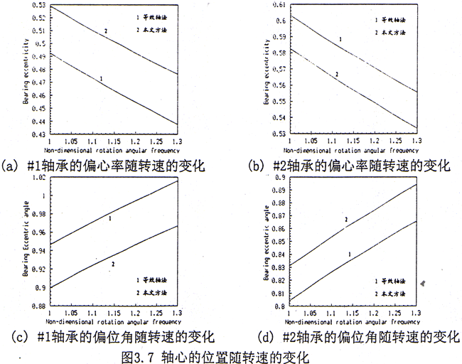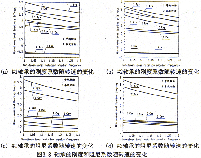 對(duì)于對(duì)稱軸承—轉(zhuǎn)子—齒輪聯(lián)軸器系統(tǒng),計(jì)算步驟如下:1)軸心的平衡位置隨轉(zhuǎn)速的變化關(guān)系,結(jié)果如圖3.7所示。2)軸承的油膜剛度和阻尼系數(shù)隨轉(zhuǎn)速的變化關(guān)系,結(jié)果如圖3.8所示。由于在兩側(cè)轉(zhuǎn)子上對(duì)應(yīng)軸承的特性相同,故僅列出在左側(cè)轉(zhuǎn)子上二個(gè)軸承(#1和#2)處的結(jié)果。