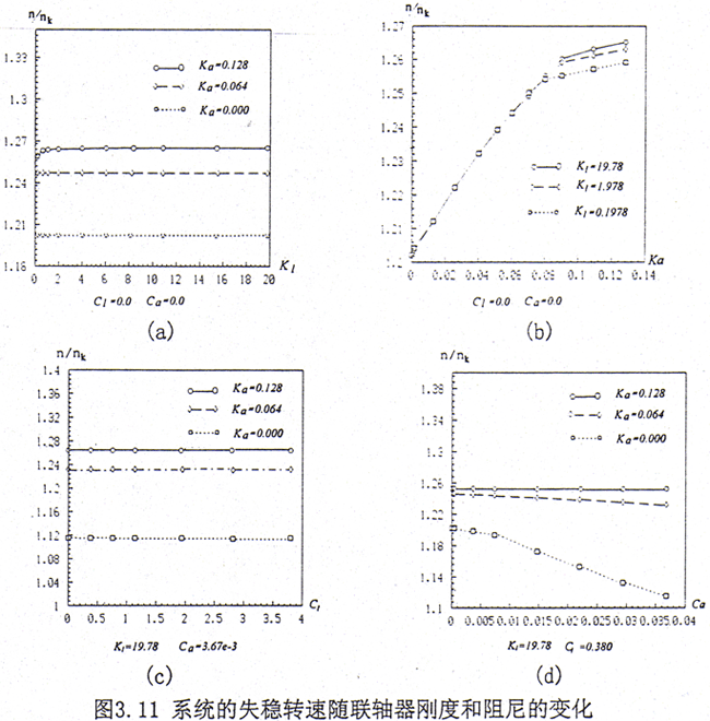 從圖3.11a可見隨橫向剛度的增大系統(tǒng)的失穩(wěn)轉速幾乎沒有變化,只有在轉角剛度較大而且橫向剛度較小時,系統(tǒng)的失穩(wěn)轉速才有所變化。圖3.11b表示系統(tǒng)失穩(wěn)轉速隨轉角剛度的變化,系統(tǒng)的失穩(wěn)轉速隨轉角剛度變化顯著。在轉角剛度較小時,幾乎是線性增加。當轉角剛度達到某一值時,失穩(wěn)轉速變化趨緩。進一步的計算表明,當繼續(xù)增大轉角剛度,系統(tǒng)的失穩(wěn)轉速趨于一定值。原因是當轉角剛度增大到某值時,在齒輪嚙合處已接近于一剛性連接的結構,如果繼續(xù)增大轉角剛度則對整體系統(tǒng)的剛度影響不大,因此系統(tǒng)的失穩(wěn)轉速變化不大。對齒輪聯(lián)軸器而言,一般橫向剛度是比較大的,因此對系統(tǒng)的失穩(wěn)轉速的影響可不予考慮。在轉角剛度較小時,系統(tǒng)的失穩(wěn)轉速隨轉角剛度的增加而增加,所以轉角剛度對系統(tǒng)的失穩(wěn)轉速影響必須予以考慮。轉角剛度與輪齒有效接觸齒寬b的平方成正比,而有效接觸齒寬b主要與聯(lián)軸器的齒形和內外齒間的接觸情況有關,一般而言b值較少,對于修形齒和鼓形齒則更小。關于輪齒的接觸情況則比較復雜,當不考慮輪齒的誤差時,則主要受工況的影響,不同的工況接觸情況不同,即使在同一工況下也會有所變化,因此對于具有情況應區(qū)別對待。