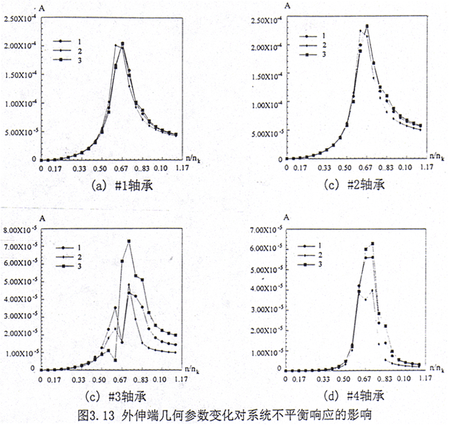 從上面的計算可見,在給定的條件下,轉子外伸端的幾何參數(shù)對在#1、#2軸承處的不平衡響應影響不大;對#3、#4軸承處的不平衡響應有影響,但量級較小,因此可以認為外伸端的幾何尺寸對系統(tǒng)的不平衡響應影響較小。
