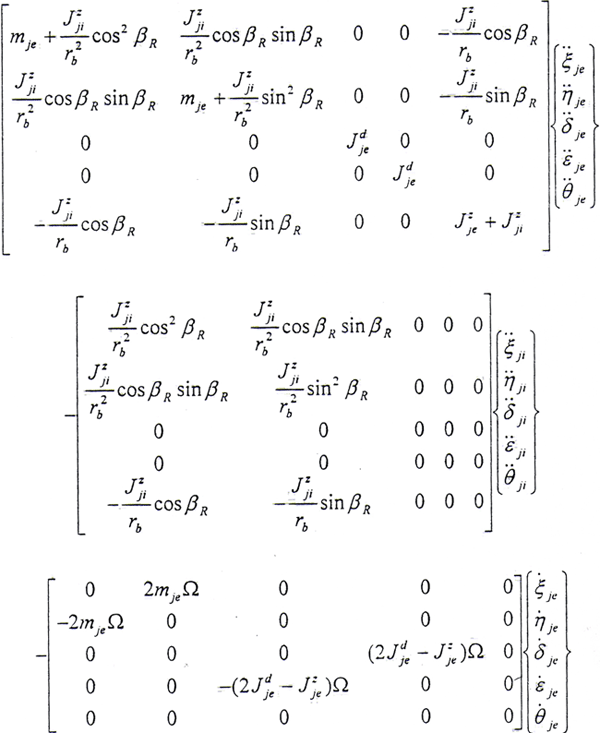 半齒輪聯(lián)軸器系統(tǒng)的動能包括內(nèi)外齒輪的平動動能和轉(zhuǎn)動動能;彈性勢能包括左右軸段的彈性勢能和半齒輪聯(lián)軸器的彈性勢能;耗散函數(shù)包括內(nèi)外齒輪之間的橫向內(nèi)阻尼和轉(zhuǎn)角內(nèi)阻尼,由于扭轉(zhuǎn)內(nèi)阻尼較小可將其忽略,具體的分析過程可參見第三章3.2.2和3.2.3節(jié)。這樣取q=ξje,ηje,δje,εje,θje,ξji,ηji,δji,εji為廣義坐標,將以上的約束方程(5.26)式代入半齒輪聯(lián)軸器系統(tǒng)的動能,勢能及耗散函數(shù)中,消去多余的變量θji,再由拉格朗日方程就可以得到在齒輪嚙合處的運動微分方程。由于推導(dǎo)過程比較冗長,在此僅列出最終的運動微分方程。對于小偏離情況,將其中的高階小量略去,則對于第j個結(jié)點(其中外齒輪下標為e,內(nèi)齒套下標為i)