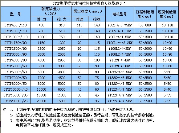 除上述三種調(diào)節(jié)功能定貨時(shí)必須文字注明外,其他請(qǐng)參照型號(hào)編制方式,認(rèn)真填寫(xiě)六大要素。 DYTP型平行式電液推桿技術(shù)參數(shù)(選型表)
