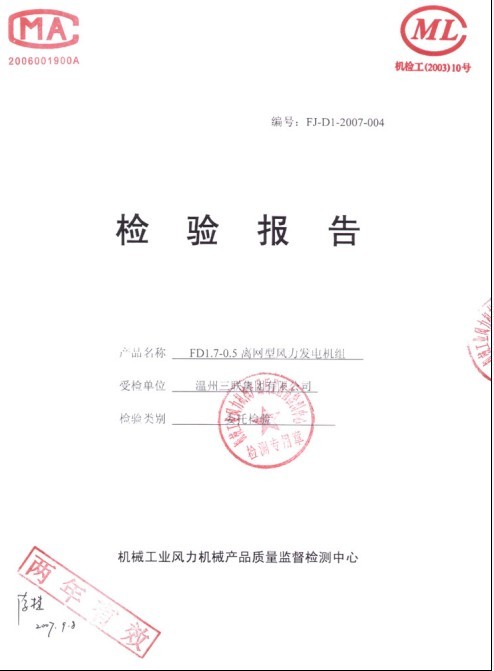 發(fā)證機(jī)構(gòu):機(jī)械工業(yè)風(fēng)力機(jī)械產(chǎn)品質(zhì)量監(jiān)督檢測(cè)中心